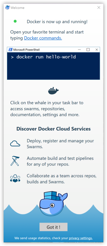 等待片刻,点击 Got it 开始使用 Docker CE。