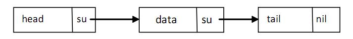 链表中的第一个元素叫 head,它指向第二个元素;最后一个元素叫 tail,它没有后继元素,所以它的 su 为 nil 值。当然真实的链接会有很多数据节点,并且链表可以动态增长或收缩。